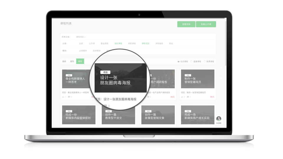 和班级同学一起,完成主流新媒体渠道运营实战,构建求职所需的全部项目作品集(学时:3周)。