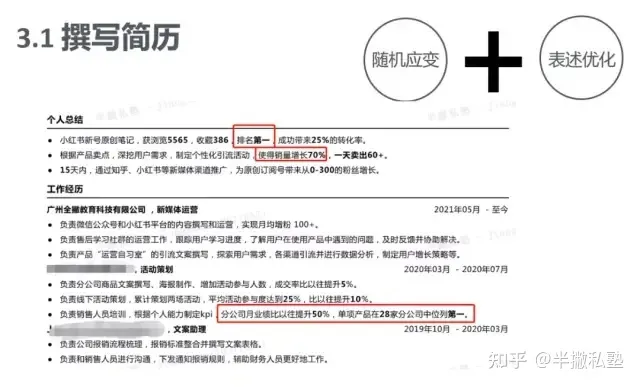 这里指的是你可以根据公司的招聘要求,调整简历中内容的顺序和说法。比如说,这家公司希望招聘你入职去做社群运营,那你就不要把之前关于内容运营的经历放到最重要的位置。半撇私塾的同学在实战班的过程中,会对社群运营工作流程进行了解。当然如果你想要有更多的运营经验,可以去报名我们不定期发布的助教兼职。所以,简单说,简历中的大部分内容你可以写一些比较通用的格式,然后在细节上进行修改。例如刚刚提到的这次招聘,你就可以把社群运营的这部分经历着重添加到简历里。