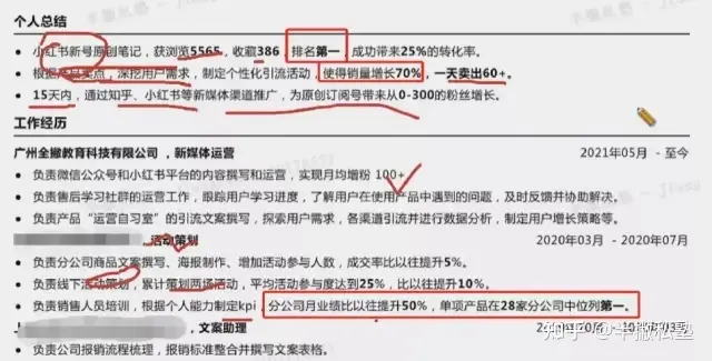 我用自己的个人总结举例给大家看看。比如,在这家公司邀请我去面试的时候,由于他们计划招聘小红书的运营岗位,所以我第一步就把自己关于小红书的运营经历写在最明显的位置。