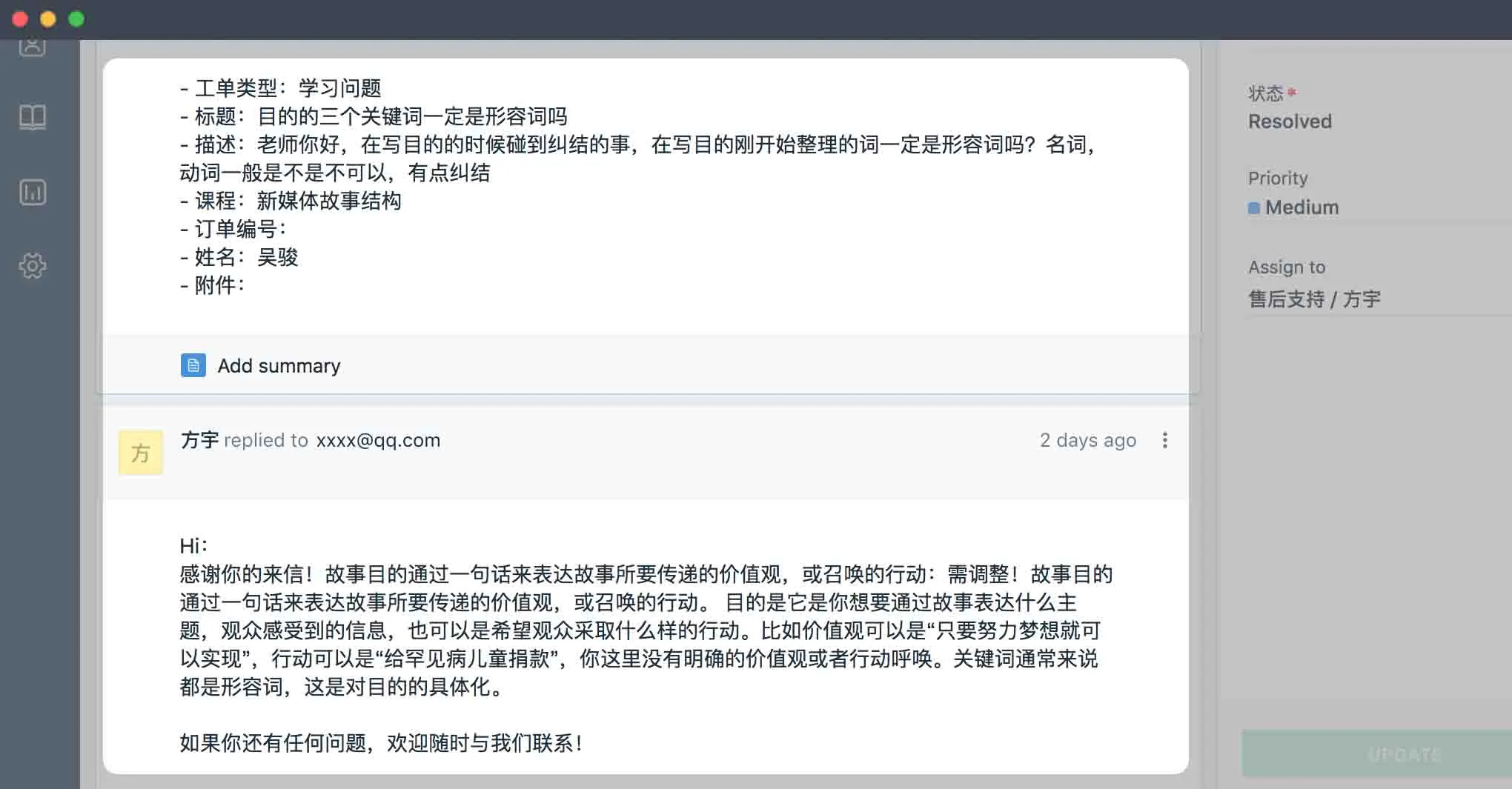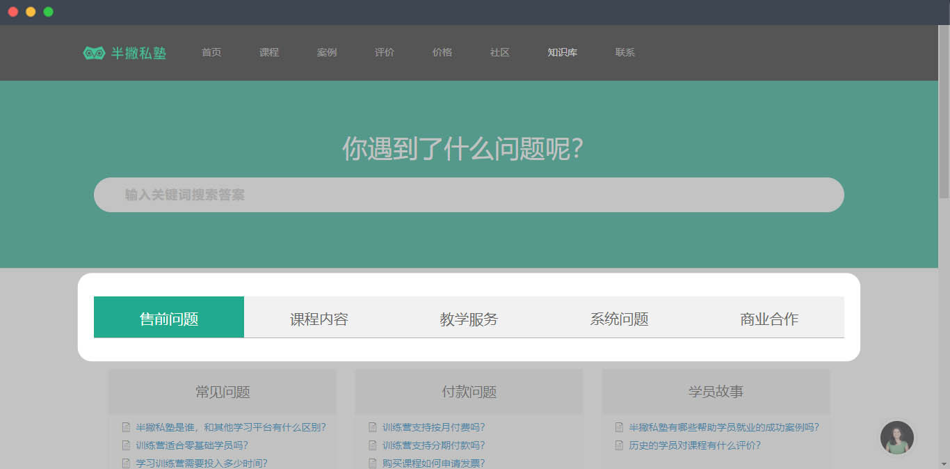 你可以在我们 7 * 24 小时开放的知识库中查找答案,不管是课程、系统还是其他,80% 的学员想问的问题在这里都有记录。