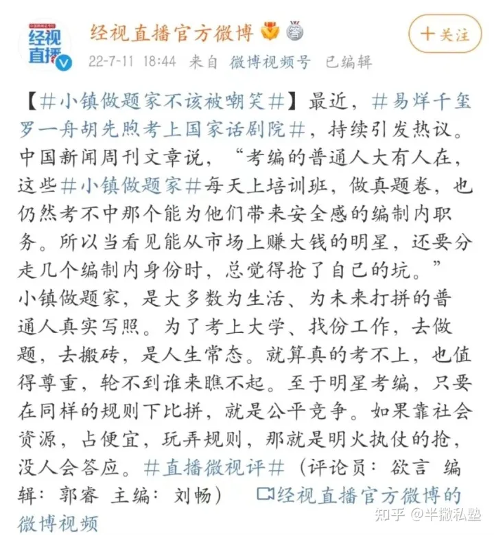 7月8日,《中国新闻周刊》发布一篇文章《易烊千玺凭什么不能考编,又为什么要考编》,将矛头直指小镇做题家。