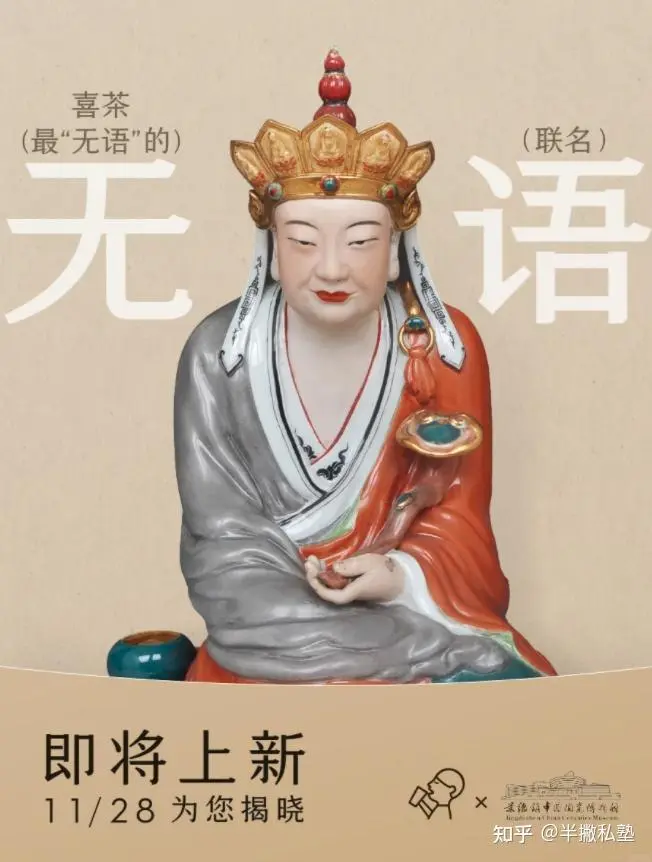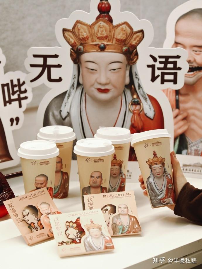 这次联名中,喜茶找到了一条新路子,同景德镇中国陶瓷博物馆合作,将陶瓷艺术家曾龙升创作的《釉下加彩十八罗汉塑像》带到大众面前。