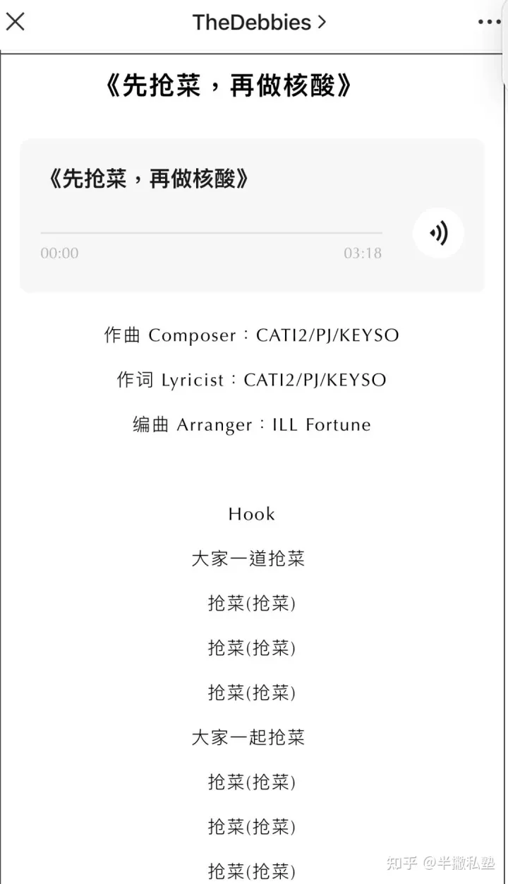 随后公众号“TheDebbies”发文《3位上海说唱歌手经多日隔离后居然……》,创作了一首沪语“抢菜”歌:《先抢菜,再做核酸》,文章迅速刷屏,发布当晚阅读量就达到10w+。
