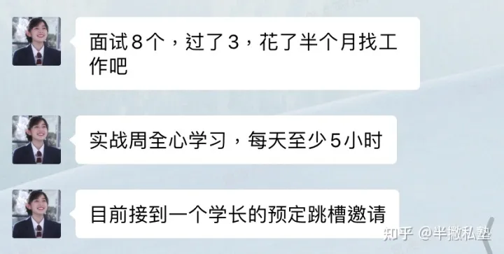 作为0基础的纯小白,她选择了半撇私塾,并通过3个月的学习,在一周内收到5家企业的面试邀请,最终拿到3家企业Offer
