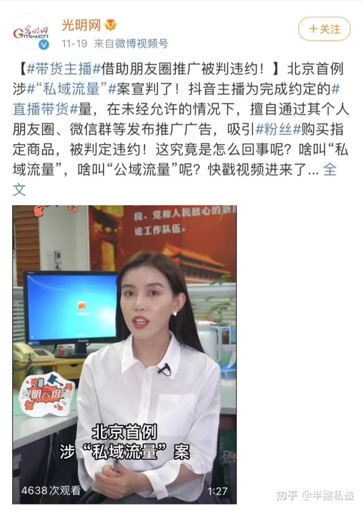 前段时间,北京首例涉“私域流量”案宣判了!抖音某主播为了完成约定的#直播带货#任务,擅自在微信群和朋友圈发布推广广告被判违约。