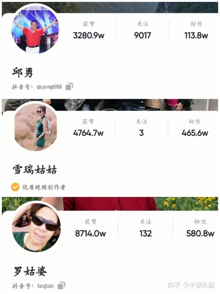 “正能量”老大叔邱勇,抖音粉丝轻轻松松过百万;年龄60+的“雪瑞姑姑”,在抖音平台粉丝高达409万;还有“重量级人物”罗姑婆”,年龄70+,被无数网友称为“情感博主”,也在抖音吸粉580万。